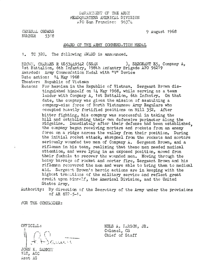 | Brown | Charles | R | SGT | ACM w/V | A/1/6 | 14-May-68 | AD-68-5388 | |