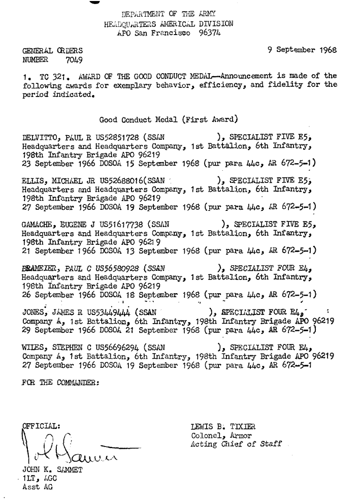 | Sterns | Frank | C | SFC | BS | A/1/6 | Feb-69 | 69-0068 | 1969 Order |