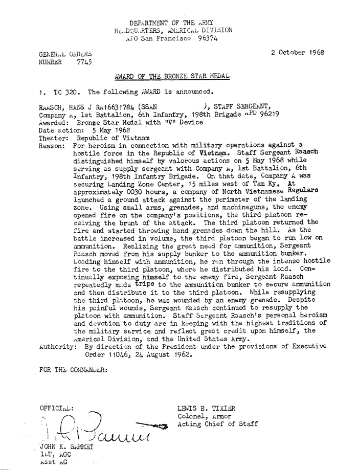 | Raasch | Hans | J | SSG | BS w/V | A/1/6 | 5-May-68 | AD-68-7745 | |
