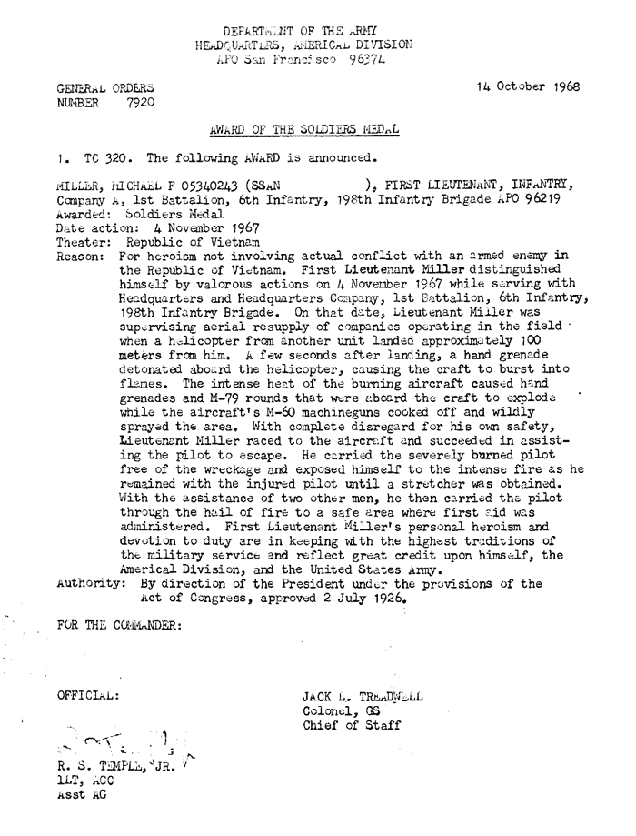 | Gilbert | Richard | L | SGT | BS | A/1/6 | May-68 | AD-68-2988 | Posthumously |