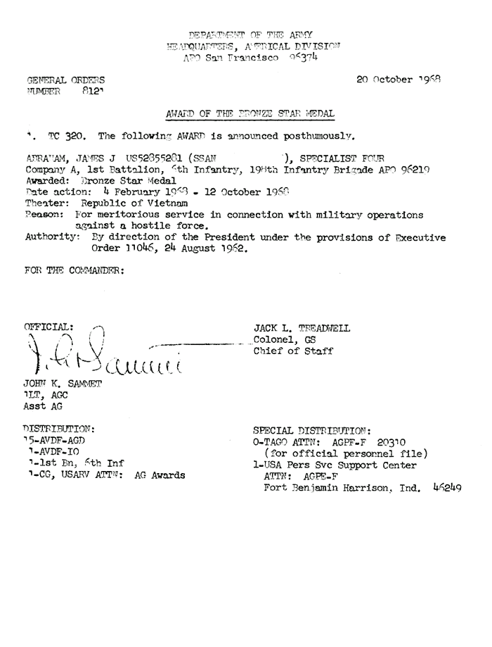 | Abraham | James | J | SP4 | BS | A/1/6 | 12-Oct-68 | AD-68-8121 | Posthumously |