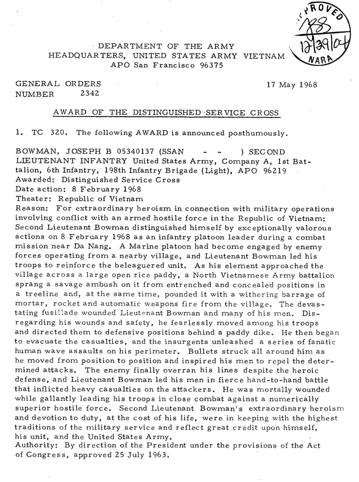 | Bowman | Joseph | 2LT | PH | A/1/6 | 19-Dec-67 | AD-68-1066 | Posthumously | |